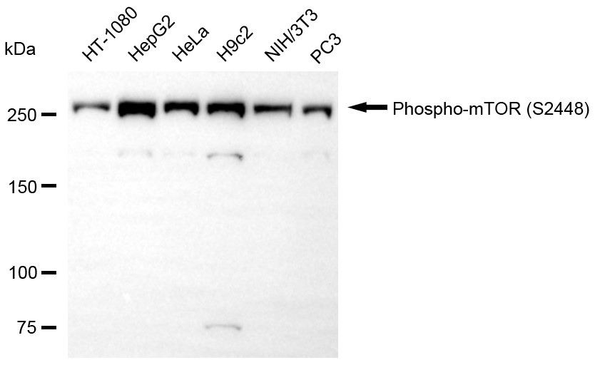 Western blotting analysis using phospho-mTOR (S2448) antibody. Total cell lysates (30 μg) from various cell lines were loaded and separated by SDS-PAGE. The blot was incubated with phospho-mTOR (S2448) antibody and HRP-conjugated goat anti-rabbit secondary antibody respectively.
