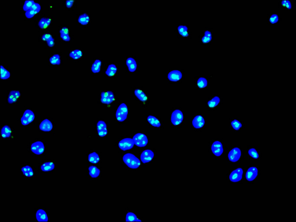 Immunofluorescence staining of HeLa cell with CSB-RA997430A0HU at 1:50 , counter-stained with DAPI. The cells were fixed in 4% formaldehyde, permeabilized using 0.2% Triton X-100 and blocked in 10% normal Goat Serum. The cells were then incubated with the antibody overnight at 4°C. The secondary antibody was Alexa Fluor 488-congugated AffiniPure Goat Anti-Rabbit IgG(H+L).