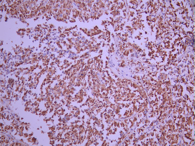 IHC image of CSB-RA997430A0HU diluted at 1:100 and staining in paraffin-embedded human liver cancer performed on a Leica BondTM system. After dewaxing and hydration, antigen retrieval was mediated by high pressure in a citrate buffer (pH 6.0). Section was blocked with 10% normal goat serum 30min at RT. Then primary antibody (1% BSA) was incubated at 4°C overnight. The primary is detected by a Goat anti-rabbit polymer IgG labeled by HRP and visualized using 0.05% DAB.