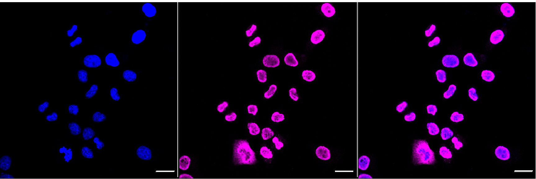 Immunocytochemical staining of HepG2 cells with NME1 antibody. Nuclei were stained blue with DAPI; NME1 was stained magenta with Alexa Fluor? 647. Images were taken using Leica stellaris 5. Protein abundance based on laser Intensity and smart gain: Medium. Scale bar, 20 μm.