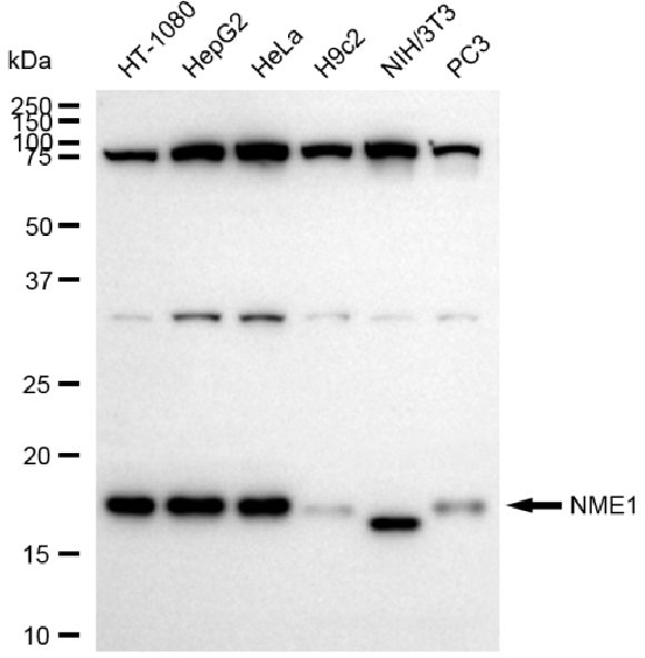Western blotting analysis using NME1 antibody. Total cell lysates (30 μg) from various cell lines were loaded and separated by SDS-PAGE. The blot was incubated with NME1 antibody and HRP-conjugated goat anti-rabbit secondary antibody respectively.