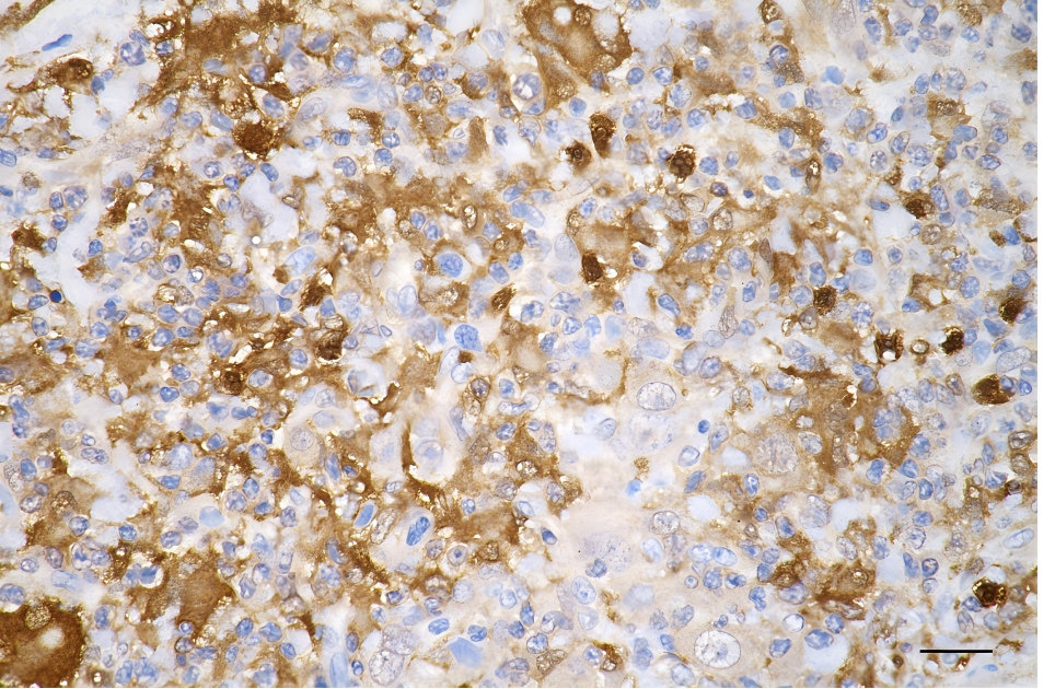 Immunohistochemistry was performed on paraffin-embedded human hepatocarcinoma using phosphogluconate dehydrogenase antibody. Antigen retrieval was done in sodium citrate buffer (pH 6.0). DAB was used for detection, with hematoxylin counterstaining. Images were acquired using a Nikon Ci-L Plus microscope (40× objective). Scale bar: 25 μm.