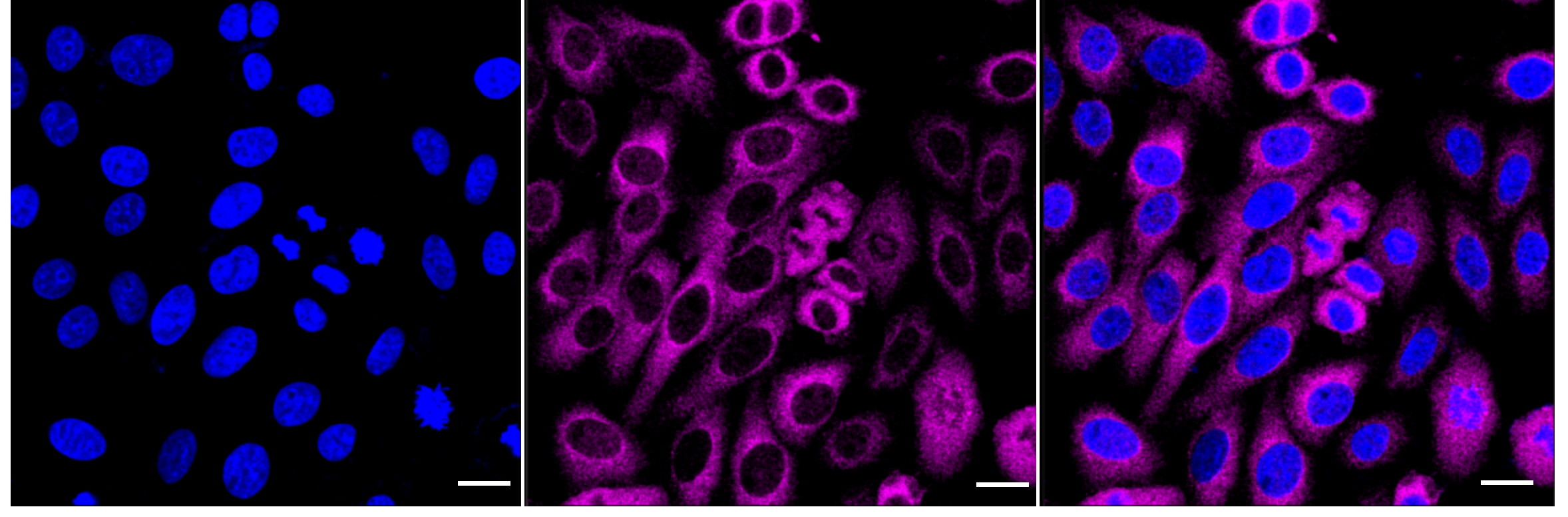 Immunocytochemical staining of HepG2 cells with PPP2R5D antibody. Nuclei were stained blue with DAPI; PPP2R5D was stained magenta with Alexa Fluor? 647. Images were taken using Leica stellaris 5. Protein abundance based on laser Intensity and smart gain: Medium. Scale bar: 20 μm.