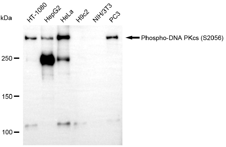 Western blotting analysis using phospho-DNA PKcs (S2056) antibody. Total cell lysates (30 μg) from various cell lines were loaded and separated by SDS-PAGE. The blot was incubated with phospho-DNA PKcs (S2056) antibody and HRP-conjugated goat anti-rabbit secondary antibody respectively.