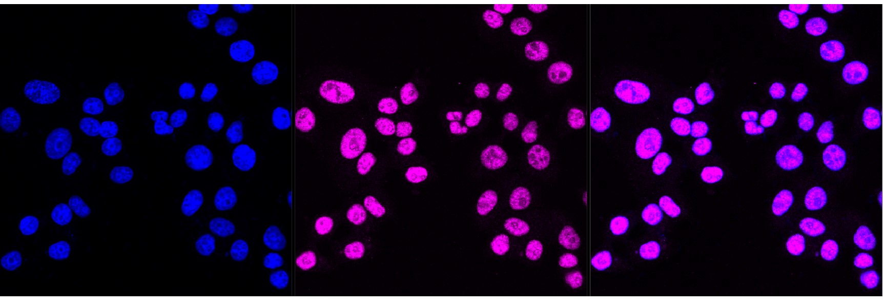 Immunocytochemical staining of HepG2 cells with PRPF4 antibody. Nuclei were stained blue with DAPI; PRPF4 was stained magenta with Alexa Fluor? 647. Images were taken using Leica stellaris 5. Protein abundance based on laser Intensity and smart gain: High. Scale bar, 20 μm.