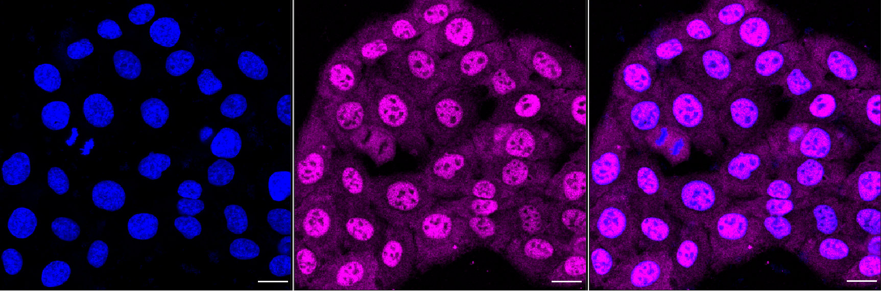 Immunocytochemical staining of HT-1080 cells with PSMA1 antibody. Nuclei were stained blue with DAPI; PSMA1 was stained magenta with Alexa Fluor? 647. Images were taken using Leica stellaris 5. Protein abundance based on laser Intensity and smart gain: Medium. Scale bar, 20 μm.
