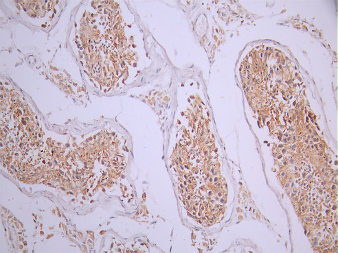 IHC image of CSB-RA582013A0HU diluted at 1:100 and staining in paraffin-embedded human testis tissue performed on a Leica BondTM system. After dewaxing and hydration, antigen retrieval was mediated by high pressure in a citrate buffer (pH 6.0). Section was blocked with 10% normal goat serum 30min at RT. Then primary antibody (1% BSA) was incubated at 4°C overnight. The primary is detected by a Goat anti-rabbit polymer IgG labeled by HRP and visualized using 0.05% DAB.