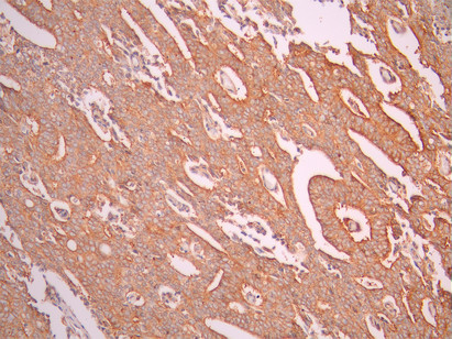 IHC image of CSB-RA582013A0HU diluted at 1:100 and staining in paraffin-embedded human prostate cancer performed on a Leica BondTM system. After dewaxing and hydration, antigen retrieval was mediated by high pressure in a citrate buffer (pH 6.0). Section was blocked with 10% normal goat serum 30min at RT. Then primary antibody (1% BSA) was incubated at 4°C overnight. The primary is detected by a Goat anti-rabbit polymer IgG labeled by HRP and visualized using 0.05% DAB.