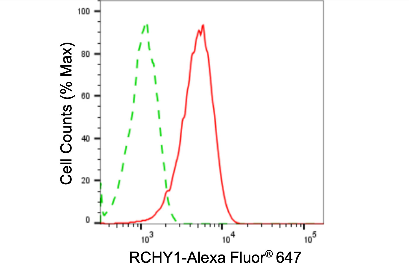 Flow cytometric analysis of RCHY1 expression in HAP-1 cells using RCHY1 antibody. Green, isotype control; red, RCHY1.