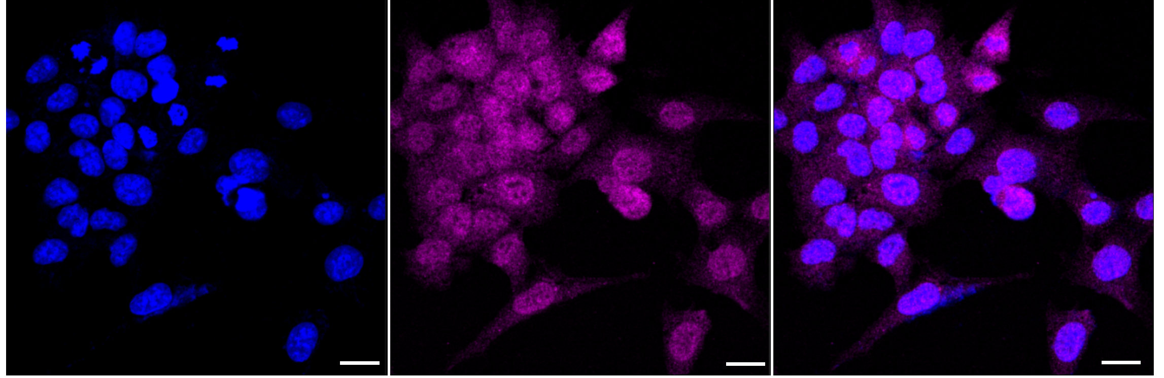 Immunocytochemical staining of HAP-1 cells with RCHY1 antibody. Nuclei were stained blue with DAPI; RCHY1 was stained magenta with Alexa Fluor? 647. Images were taken using Leica stellaris 5. Protein abundance based on laser Intensity and smart gain: Medium. Scale bar: 20 μm.