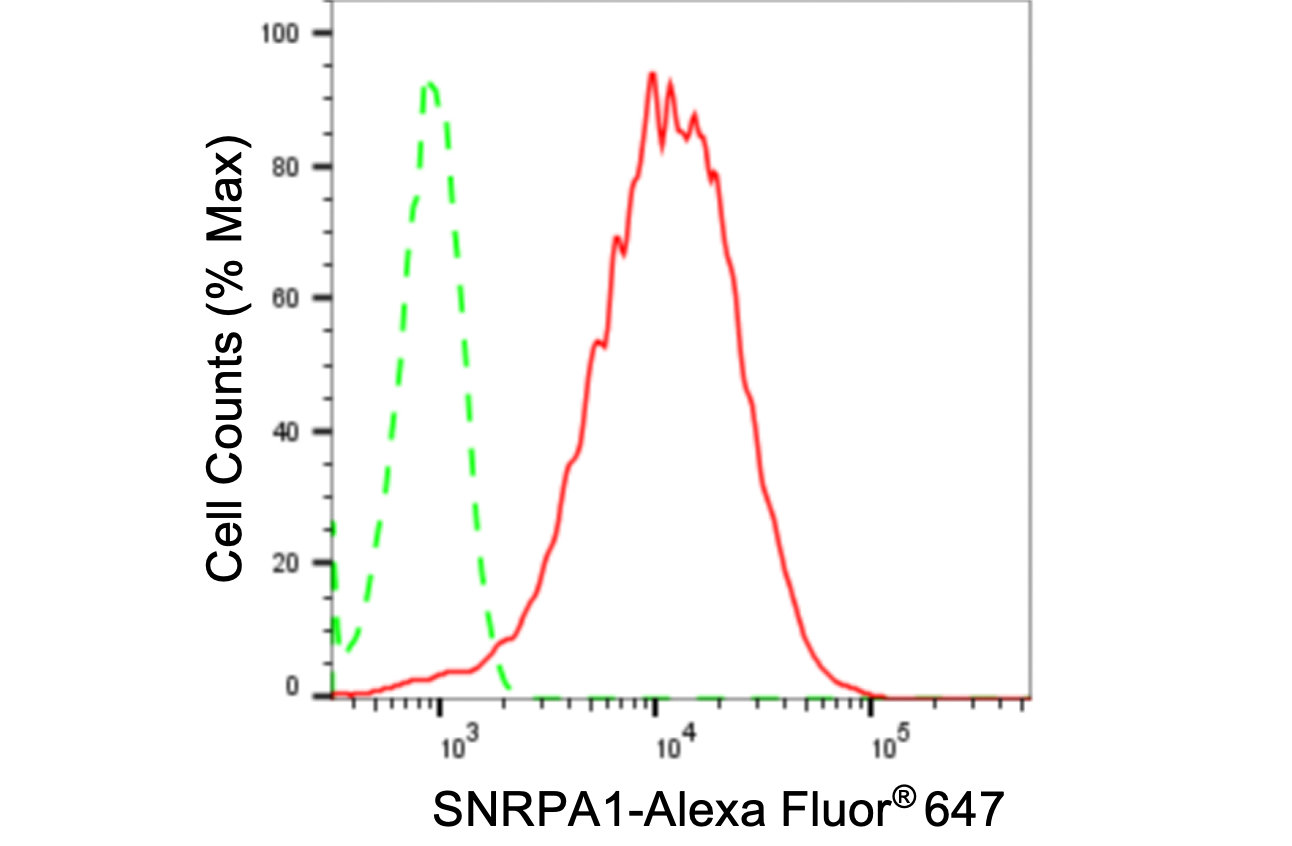 Flow cytometric analysis of SNRPA1 expression in HepG2 cells using SNRPA1 antibody. Green, isotype control; red, SNRPA1.