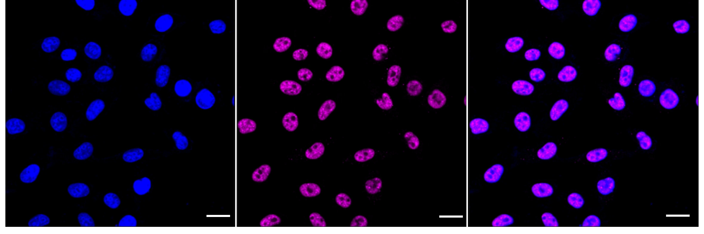 Immunocytochemical staining of HepG2 cells with SNRPA1 antibody. Nuclei were stained blue with DAPI; SNRPA1?was stained magenta with Alexa Fluor? 647. Images were taken using Leica stellaris 5. Protein abundance based on laser Intensity and smart gain: High. Scale bar: 20 μm.