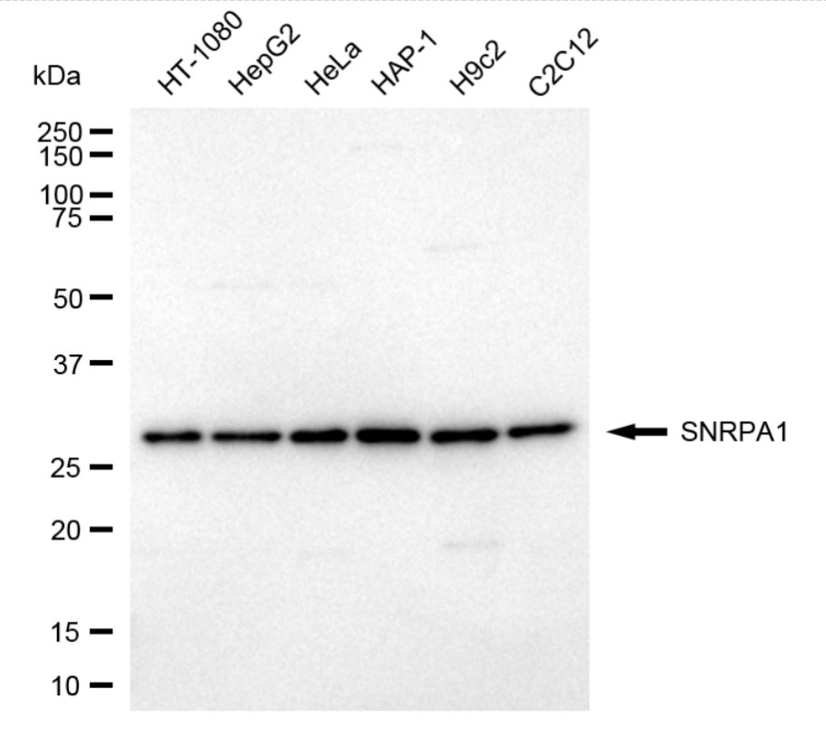 Western blotting analysis using SNRPA1 antibody. Total cell lysates (30 μg) from various cell lines were loaded and separated by SDS-PAGE. The blot was incubated with SNRPA1 antibody and HRP-conjugated goat anti-rabbit secondary antibody respectively.