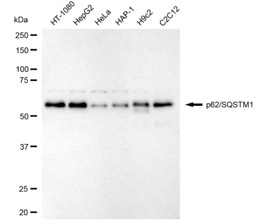 Western blotting analysis using p62/SQSTM1 antibody. Total cell lysates (30 μg) from various cell lines were loaded and separated by SDS-PAGE. The blot was incubated with p62/SQSTM1 antibody and HRP-conjugated goat anti-rabbit secondary antibody respectively.