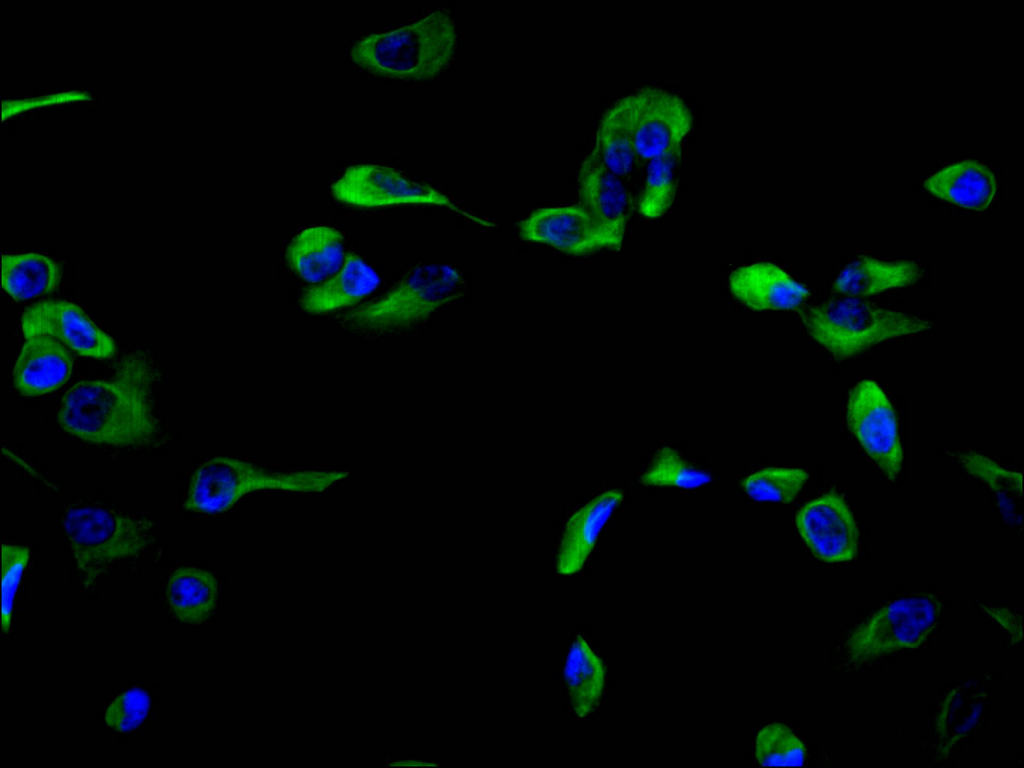 Immunofluorescence staining of U251 cell with CSB-RA967831A0HU at 1:50 , counter-stained with DAPI. The cells were fixed in 4% formaldehyde, permeabilized using 0.2% Triton X-100 and blocked in 10% normal Goat Serum. The cells were then incubated with the antibody overnight at 4°C. The secondary antibody was Alexa Fluor 488-congugated AffiniPure Goat Anti-Rabbit IgG(H+L).