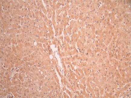 IHC image of CSB-RA967831A0HU diluted at 1:100 and staining in paraffin-embedded human liver tissue performed on a Leica BondTM system. After dewaxing and hydration, antigen retrieval was mediated by high pressure in a citrate buffer (pH 6.0). Section was blocked with 10% normal goat serum 30min at RT. Then primary antibody (1% BSA) was incubated at 4°C overnight. The primary is detected by a Goat anti-rabbit polymer IgG labeled by HRP and visualized using 0.05% DAB.