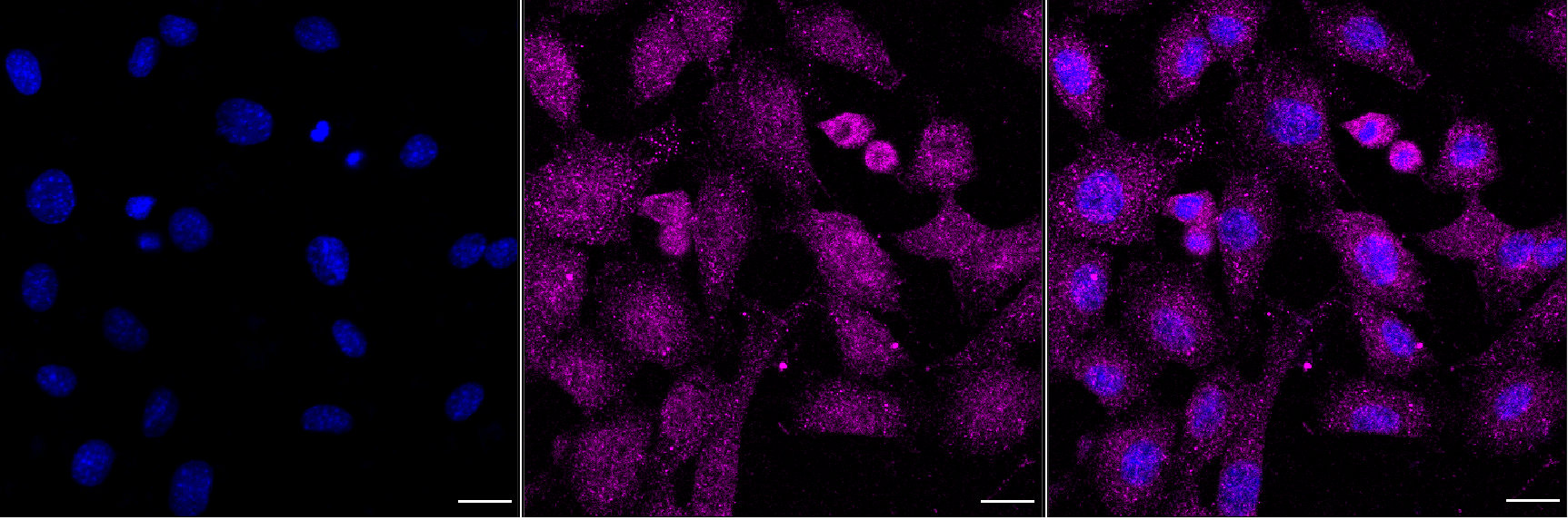 Immunocytochemical staining of C2C12 cells with Tripeptidyl peptidase 2 antibody. Nuclei were stained blue with DAPI; Tripeptidyl peptidase 2 was stained magenta with Alexa Fluor? 647. Images were taken using Leica stellaris 5. Protein abundance based on laser Intensity and smart gain: Medium. Scale bar, 20 μm.