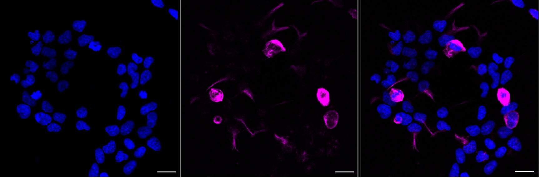 Immunocytochemical staining of Hela cells with Phospho-Vimentin (Ser56) protein antibody. Nuclei were stained blue with DAPI; Phospho-Vimentin (Ser56) was stained magenta with Alexa Fluor? 647. Images were taken using Leica stellaris 5. Protein abundance based on laser Intensity and smart gain: Medium. Scale bar, 20 μm.