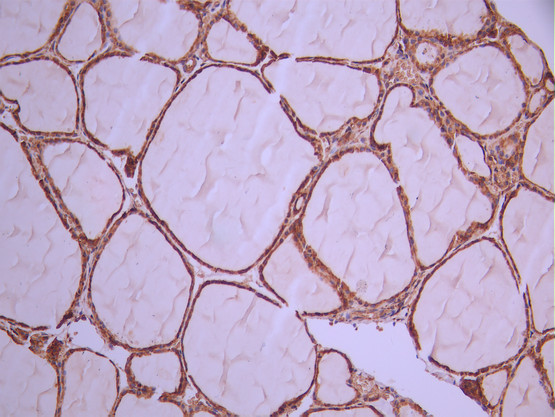 IHC image of CSB-RA147408A0HU diluted at 1:100 and staining in paraffin-embedded human thyroid tissue performed on a Leica BondTM system. After dewaxing and hydration, antigen retrieval was mediated by high pressure in a citrate buffer (pH 6.0). Section was blocked with 10% normal goat serum 30min at RT. Then primary antibody (1% BSA) was incubated at 4°C overnight. The primary is detected by a Goat anti-rabbit polymer IgG labeled by HRP and visualized using 0.05% DAB.