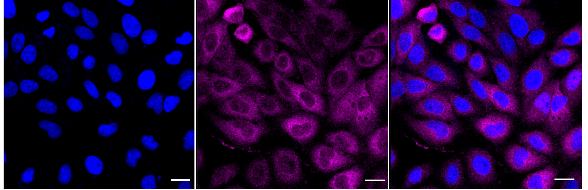 Immunocytochemical staining of HepG2 cells with ZBTB33 antibody. Nuclei were stained blue with DAPI; ZBTB33 was stained magenta with Alexa Fluor? 647. Images were taken using Leica stellaris 5. Protein abundance based on laser Intensity and smart gain: Medium. Scale bar: 20 μm.