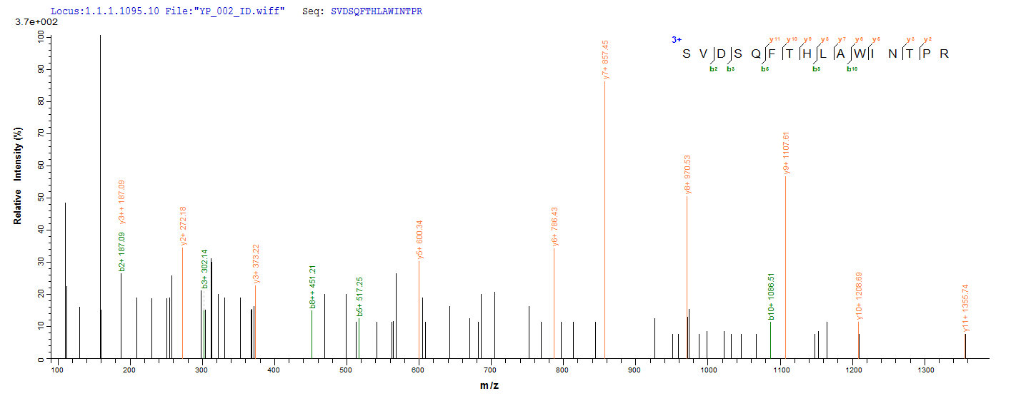 Based on the SEQUEST from database of E.coli host and target protein, the LC-MS/MS Analysis result of CSB-EP339235HU could indicate that this peptide derived from E.coli-expressed Homo sapiens (Human) PRDX2.